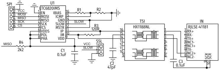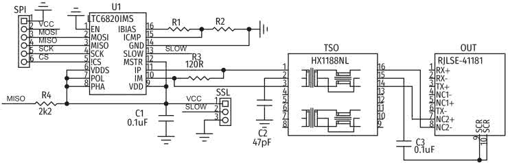 Sygnał z mikroprocesora nadrzędnego doprowadzony jest do złącza SPI, a stąd do układu U1, pracującego w trybie nadajnika (MSTR=1). Po zakodowaniu sygnał jest wzmacniany i zasila transformator izolujący TSO. Po dopasowaniu i izolacji galwanicznej doprowadzony jest do gniazda OUT typu RJ45. Do transmisji wykorzystany jest typowy kabel ethernetowy typu patch (bez przeplotu). Używane są tylko żyły 7 i 8. Zwora SSL służy do dostosowania układu do różnych częstotliwości zegara SPI. Przy zwarciu 1-2 czyli SLOW=1, układ pracuje poprawnie z zegarem poniżej 200 kHz, przy zwartym 2-3 powyżej. Rezystory R1/R2 ustalają prądy drivera transformatora i progi komparatorów odbiorczych i wymagają doboru w zależności od długości magistrali.