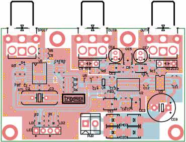 Schemat montażowy przetwornika pokazano na rysunku 2. Zmontowano go na niewielkiej, dwustronnej płytce drukowanej. Sposób montażu jest typowy i nie wymaga opisywania. Moduł nie wymaga uruchomienia. Po poprawnym zmontowaniu i sprawdzeniu poprawności można dołączyć źródło S/PDIF oraz zasilanie i cieszyć się muzyką.
