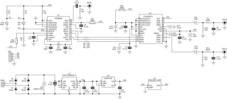 Poprawne zerowanie układów odbiornika i przetwornika zapewnia U5 typu ADM1815T. Aplikację WM8804 uzupełniają dwa filtry zasilania: dławik FB1 i kondensator C1 dla obwodu PLL oraz dławik FB2, i kondensator C4 dla części cyfrowej odbiornika. Wyjściowy sygnał I²S przez rezystory R6…R8 jest doprowadzony do układu przetwornika U2 (CS4350). Po odfiltrowaniu za pomocą filtrów RC sygnał analogowy jest doprowadzony do gniazda RCA, do wyjść OUTA/OUTB. Filtr złożony z dławika FB3 oraz kondensatorów CE1 i C6, filtruje zasilanie części cyfrowej przetwornika, natomiast z dławika L4 i kondensatora C10 – zasilanie części analogowej. Kondensatory CE3 i C 4 są elementami wbudowanego układu polaryzacji.