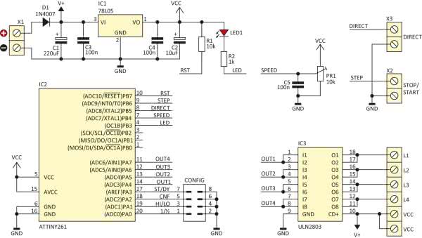 Schemat ideowy sterownika silnika pokazano na rysunku 1. Jest on zasilany napięciem stałym z zakresu 7...24 V doprowadzonym do złącza X1. Dioda D1 stanowi zabezpieczenie przed niewłaściwą polaryzacją napięcia wejściowego. Napięcie zasilające jest doprowadzone stabilizatora IC1 (78L05), który dostarcza zasilania +5 V dla mikrokontrolera.