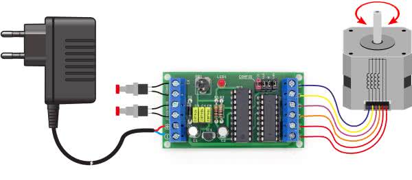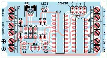 - Zworka CNF służy do wybór sposobu sterowania. Brak zwory – sterowanie impulsowe. Zworka założona – sterowanie stanowe; przy sterowaniu stanowym zwarcie lub rozwarcie złącz sterujących powoduje zmianę kierunku obrotów lub zatrzymanie silnika. Natomiast sterowanie impulsowe zmienia kierunek obrotów przy każdorazowym krótkim zwarciu złącza DIRECT i zatrzymuje lub uruchamia silnik przy każdorazowym krótkim zwarciu wyprowadzeń STOP/START, możemy wtedy sterować układem za pomocą mikroprzełączników dołączonych do tych złącz.