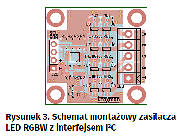 Sygnały wyjściowe LR…LW sterują programowalnymi źródłami prądowymi U2…U9 typu BCR321UE6327. Każde ze źródeł ma programowalny prąd wyjściowy w zakresie 10…250 mA, ustalany przez rezystor dołączony do wyprowadzenia Rext. Wykres ułatwiający dobór rezystora prezentuje rysunek 2. Dla zmniejszenia obciążenia cieplnego oraz dla uzyskania prądu wyjściowego 350 mA (dla LED 5 W) źródła połączone są parami równolegle. Wejście sterujące EN, sterowane jest sygnałem PWM umożliwiającym regulację jasności każdego kanału RGBW. Ze względu na pobór mocy zasilanie LED jest odseparowane od zasilania magistrali I2C.