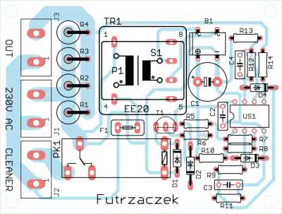 Układ automatycznego włącznika został zmontowany na jednostronnej płytce drukowanej o wymiarach 74 mm×56 mm, której schemat montażowy pokazano na rysunku 2. Wszystkie użyte elementy mają obudowy przystosowane do montażu przewlekanego, dlatego z lutowaniem poradzi sobie nawet początkujący elektronik. Warto go prowadzić od elementów najniższych po najwyższe, a pod układ scalony polecam zastosować podstawkę. Szerokie ścieżki prowadzące do złącz ARK mogą przewodzić prądy o dużym natężeniu, dlatego warto pogrubić je dodatkową warstwą cyny oraz nalutowaniem na nie miedzianych przewodów. Jeżeli montaż przebiegł pomyślnie, urządzenie gotowe jest do pracy. Podłączając przewody zasilające do odpowiednich urządzeń oraz wtyczki sieciowej, należy pamiętać również o przewodach ochronnych, które należy połączyć poza płytką wyłącznika.