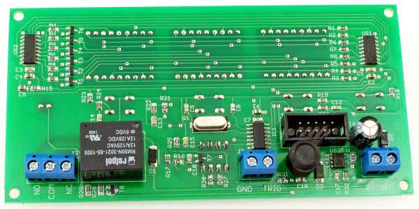 Zaciski przekaźnika obsługującego wyjście są dołączone do złącza J3 – zarówno styk normalnie zwarty (NC), jak i normalnie otwarty (NO). Cewkę przekaźnika załącza tranzystor T8, po wprowadzeniu go w stan nasycenia. Prąd z jego bazy jest wyciągany poprzez diodę LED4, sygnalizującą załączenie przekaźnika, oraz rezystor R29, ograniczający prąd. Przekaźnik załącza się po ustawieniu stanu niskiego na wyjściu QH układu US2. Natężenie prądu wypływającego z bazy T8 to ok. 4,3 mA, zakładając 2 V spadku napięcia na diodzie świecącej.