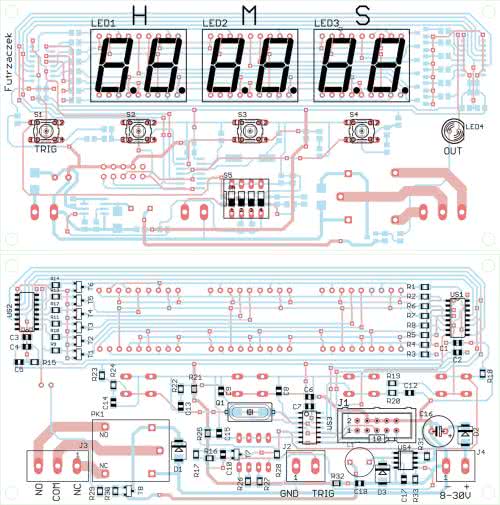 Układ uniwersalnego przekaźnika czasowego został zmontowany na dwustronnej płytce drukowanej o wymiarach 130×65 mm, której schemat montażowy i wzór ścieżek przewodzących przedstawia rysunek 3. W odległości 3 mm od krawędzi płytki znajdują się otwory o średnicy 3 mm każdy, służą zamocowaniu płytki w obudowie.