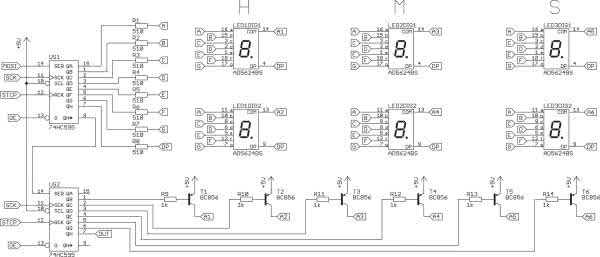 Układy 74HC595 zostały połączone kaskadowo, toteż zachowują się jak jeden rejestr, o pojemności 16 bitów. Zapewniają w ten sposób dostateczną liczbę wyprowadzeń wyjściowych. Wadą tego rozwiązania jest konieczność wysyłania szeregowo 16 bitów przy każdym odświeżeniu zawartości wyświetlacza, lecz dostatecznie szybki zegar taktujący rdzeń mikrokontrolera pozwala ominąć ten problem.