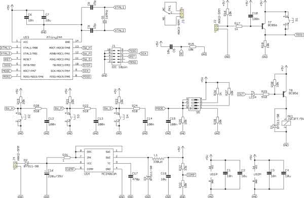 Jako mikrokontroler został wybrany Attiny24A, ponieważ posiada dostateczną liczbę programowalnych wyprowadzeń, ma wbudowany generator dla rezonatora kwarcowego oraz kosztuje relatywnie niewiele. Jego rdzeń jest taktowany sygnałem zegarowym pochodzących z generatora stabilizowanego rezonatorem kwarcowym o częstotliwości 16 MHz. Daje to wystarczającą dokładność odmierzania czasu. Kondensatory C8 i C9 są zalecane przez notę katalogową producenta mikrokontrolera.