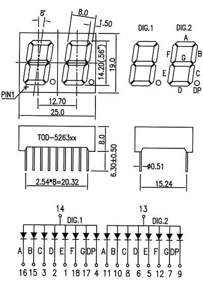 Katody poszczególnych segmentów wszystkich wyświetlaczy zostały połączone razem, a ich prąd jest ograniczony przez rezystory R1…R8 (510 V) do około 5,5 mA – zakładając, że napięcie przewodzenia diody w segmencie to ok. 2 V. Segmenty świecą dostatecznie jasno, nie pobierając przy tym znacznego prądu. Anody segmentów są sterowane za pośrednictwem kluczy nasyconych na tranzystorach PNP, gdyż całkowity prąd danej cyfry może osiągnąć 44 mA, co jest wartością zbyt dużą, jak dla jednego wyprowadzenia układu 74HC595 (maksymalnie 35 mA). Można zastosować inne wyświetlacze (w szczególności, o innej barwie świecenia) niż zaproponowane w spisie części, muszą tylko mieć wymiary i układ wyprowadzeń zgodny z zastosowanymi – rysunek 2.