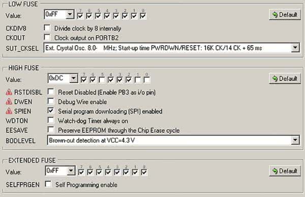 Prawidłowo zmontowany układ należy zaprogramować, aby stał się funkcjonalny. Do tego służy dostarczony wsad pamięci Flash mikrokontrolera ATtiny24A. Oprócz tego, należy ustawić jego bity zabezpieczające (tzw. fusebity) według widoku z rysunku 5. Aby było to możliwe, do złącza J4 należy doprowadzić zasilanie.
