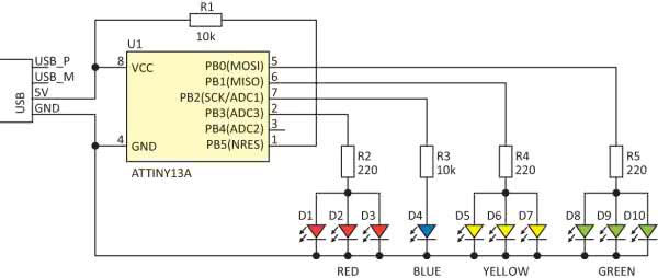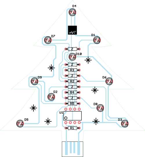 Schemat ideowy choinki pokazano na rysunku 1, natomiast montażowy na rysunku 2. Sercem choinki jest mikrokontroler ATtiny13. Dziesięć kolorowych diod LED sterowanych bezpośrednio z portów mikrokontrolera zostało połączonych w cztery grupy. Rezystory R2…R5 ograniczają prąd płynący przez te diody. Są one zaświecane sekwencyjnie, zapewniając w ten sposób ciekawy efekt świetlny. Zastosowanie mikrokontrolera w roli sterownika diod LED zdecydowanie upraszcza układ oraz daje nieograniczone możliwości w zakresie uzyskania dowolnie, samodzielnie wymyślonych efektów świetlnych.
