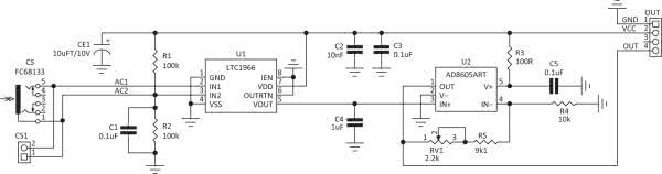 Po konwersji, wyjściowe napięcie stałe z U1 podawane jest na wzmacniacz-bufor U2 oparty o wzmacniacz AD8605. Układ U2 separuje wyjście LTC1966 o względnie dużej impedancji (ok. 85 kV) od wejść A/C zapewniając minimalny błąd przetwarzania. Dodatkowo, sygnał jest wzmocniony ×2, a dokładną wartość podczas skalowania układu można ustawić potencjometrem RV1. Sygnał wyjściowy oraz zasilanie 3,3…5 V/20 mA są doprowadzone do złącza OUT. Zakres 0…2 V może zostać rozszerzony poprzez zmianę R5 po uwzględnieniu zakresu napięcia współpracującego A/C.
