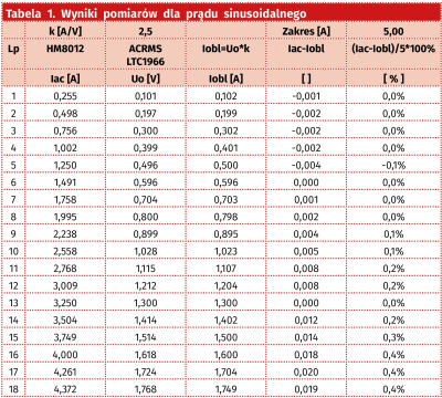 Dla modelu z przekładnikiem 5 A, współczynnik przetwarzania wynosi 2,5 A/V, a dokładność przetwarzania w zakresie 50 Hz…1 kHz jest lepsza od 2%.