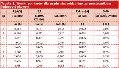 - tabela 2. – prąd sinusoidalny po prostowaniu jednopołówkowym),