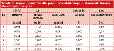 - tabela 3 – prąd odkształcony zasilający fazowy sterownik tyrystorowy dla różnych obciążeń.