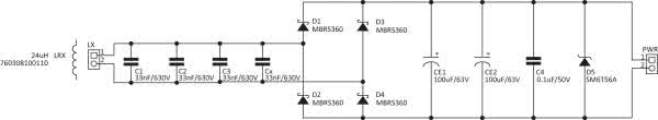 Odbiornik zrealizowano najprościej, jak to możliwe. Sygnał z odbiorczego obwodu rezonansowego złożonego z cewki LRX i kondensatorów C1…C3, Cx jest prostowany mostkiem zbudowanym z diod Schottky'ego D1…D4. Napięcie jest filtrowane za pomocą kondensatorów CE1, CE2. Transil D5 zapobiega przekroczeniu napięcia 56 V w przypadku pracy bez obciążenia.