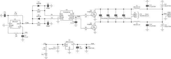 Układ składa się z dwóch bloków, nadajnika oraz odbiornika z prostownikiem i filtrem dostarczającym napięcia stałego. Schemat nadajnika przedstawiono na rysunku 1, a odbiornika na rysunku 2. Tym razem, zrezygnowałem ze stosowania specjalizowanych układów bezprzewodowej transmisji mocy (WPT), na rzecz standardowych dostępnych powszechnie elementów. Ma to oczywiście wady w postaci gorszych parametrów układu, ale otwiera drogę do eksperymentów z mocą, zasięgiem oraz funkcją zestawu (zasilacz, ładowarka itp.).