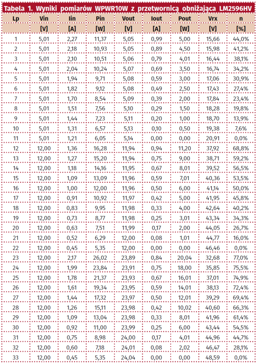 Wyniki pomiarów modelu dla wartości napięcia wyjściowego przetwornicy umieszczono w tabeli 1. Nie jest zaskoczeniem, że wraz ze wzrostem napięcia zasilania możliwe jest przesłanie większej mocy. Rośnie też sprawność transmisji (wartość zawiera w sobie także sprawność przetwornicy LM2596HV). Dla typowego zastosowania, jakim jest na przykład, ładowanie telefonu napięciem 5 V, możliwie jest osiągnięcie mocy do 5 W przy sprawności mniejszej od 50%. Szczególnie dobre wyniki otrzymuje się przy zasilaniu nadajnika napięciem 12 V i napięciu wyjściowym przetwornicy ustawionym na 12 lub 24 V. Możliwa jest wtedy transmisja mocy 10…20 W przy sprawności dochodzącej do 77%. Napięcie Vrx jest to napięcie na wyjściu odbiornika. Należy pamiętać, że praca odbiornika bez obciążenia spowoduje narastanie napięcia wyjściowego aż do zadziałania transila D5. Odbiornik jest źródłem energii o stosunkowo dużej rezystancji wyjściowej, co mocno uzależnia sprawność przekazu od obciążenia.