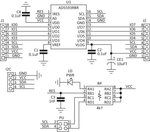 Schemat ideowy modułu ekspandera GPIO pokazano na rysunku 1. Moduł zawiera układ U1-AD5593R, rezystory polaryzujące magistralę I2C. Zwora PU umożliwia ich odłączenie. Obecność napięcia zasilającego sygnalizuje LED LD. Kondensator C3 i rezystor RP-2 generują reset po włączeniu zasilania. Moduł jest zgodny ze standardem ARDuino I2C. Sygnały magistrali i zasilanie są doprowadzone do 4-pinowego złącza typu EH złącza typu EH (I2C).