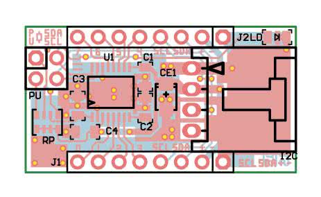 Moduł zmontowano na dwustronnej płytce drukowanej. Schemat montażowy pokazano na rysunku 2. Sposób montażu jest typowy i nie wymaga opisywania. Konstrukcja mechaniczna modułu umożliwia bezproblemową współpracę z płytkami stykowymi lub prototypowymi. Zalecam stosowanie długich (30…40 mm) złączy SIP wlutowanych tak, aby wyprowadzenia wystawały po obu stronach płytki drukowanej. Taki sposób montażu umożliwia wygodne używanie w płytkach stykowych oraz ułatwia wyprowadzenie sygnałów i rozszerzanie magistrali I2C.