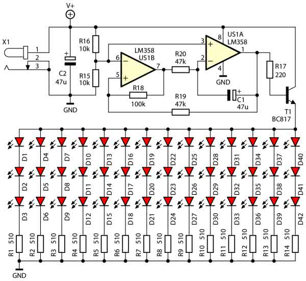 Aby zmienić częstotliwość generowanego przebiegu, można zmienić wartość rezystora R20 lub kondensatora C1. Aby zmienić amplitudę (szerokość pętli histerezy) generowanego przebiegu, należy zmienić wartość rezystora R18. Efektem tej zmiany będą przesunięte progi wygaszania i załączania LED. Do wyjścia wzmacniacza operacyjnego US1A jest dołączony tranzystor T1 przez rezystor R17 ograniczający prąd jego bazy. Ten tranzystor steruje pracą 42 czerwonych diod LED pogrupowanych po 3 w gałęzi.