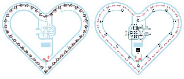Schemat montażowy „Pulsującego serca LED” zamieszczono na rysunku 2. Wykonano je z elementów SMD, co wymaga nieco wprawy przy lutowaniu. W montażu pomocną będzie fotografia. „Serce” nie wymaga uruchamiania. Zmontowane ze sprawnych elementów będzie działało natychmiast po włączeniu zasilania. Płytkę zasila się za pomocą gniazdka przylutowanego od strony lutowania. Aby zmniejszyć „wywrotność” płytki o tak specyficznym kształcie, warto wykonać ze srebrzonego drutu nóżkę wygiętą w kształt podkowy. Taki element należy przylutować do odkrytego pola miedzi tuż nad gniazdem zasilania (fotografia 3).