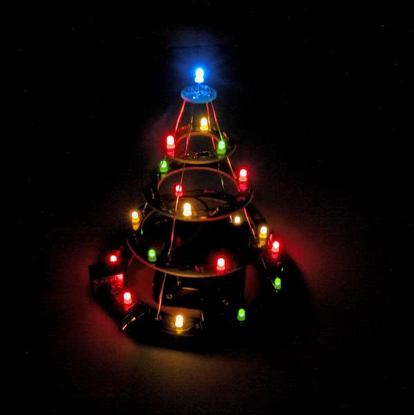 Choinka składa się z 22 różnokolorowych diod LED imitujących lampki choinkowe. Ich świeceniem steruje mikrokontroler. Jest zasilana napięciem, którego źródłem może być złącze USB lub 3 baterie AA (LR6). Efekt przestrzenności, co doskonale ukazuje zdjęcie tytułowe, uzyskujemy dzięki pierścieniom z laminatu, które należy zmontować i połączyć w taki sposób, aby tworzyły stożek. Łączenia wykonane ze srebrzonego drutu doskonale będą zastępować łańcuchy choinkowe.