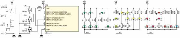 Schemat ideowy choinki pokazano na rysunku 1. Jej pracą steruje mikrokontroler ATtiny13 taktowany wewnętrznym sygnałem zegarowym. Zastosowanie mikrokontrolera upraszcza budowę obwodu generującego animacje. Diody LED są sterowane z wyjść mikrokontrolera za pomocą tranzystorów MOSFET T1…T3. Podzielono je na grupy, z których każda ma włączony rezystor ograniczający prąd danej gałęzi do około 5 mA. Tak mały prąd pozwoli załączyć diody z jasnością proporcjonalną do wielkości drzewka. Choinkę należy zasilać napięciem stabilizowanym +5 V. Ze względu na niewielki średni pobór prądu źródłem zasilania może być też pakiet trzech ogniw AA (LR6) umieszczanych w koszyku baterii bez wyłącznika. Przełącznik S1 pozwala wybrać źródło zasilania, co w przypadku zastosowania tylko jednego pozwoli uzyskać funkcję wyłącznika naszego drzewka.