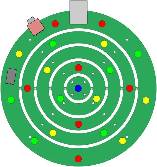 Schemat montażowy choinki pokazano na rysunku 2. Montaż układu zaczynamy od rozłączenia poszczególnych pierścieni obwodu drukowanego. Pozostałości łączników należy zeszlifować papierem ściernym lub pilnikiem. Wszystkie elementy są w obudowach do montażu przewlekanego, z którym bez problemu poradzą sobie osoby mniej doświadczone w lutowaniu. Odpowiednio przygotowane płytki należy montować rozpoczynając od wlutowania rezystorów. Aby uzyskać odpowiedni efekt migania diod LED należy je wlutować zgodnie z rysunkiem 3, na którym widoczne jest umiejscowienie poszczególnych kolorów diod LED oraz najważniejszych komponentów choinki.