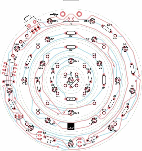 Dla ułatwienia poszczególne pierścienie warto ułożyć jeden w drugim tak by punkty lutownicze np. P+1...P+5 były względem siebie w jednej linii. Niebieską diodę LED D22 znajdującą się na czubku choinki należy wlutować około 5 mm nad płytką. W kolejnym etapie montażu przechodząc stopniowo do coraz większych elementów należy zakończyć go gniazdem USB. Podczas montażu należy zwracać szczególną uwagę na biegunowość komponentów. Wcięcie w obudowie podstawki i układu scalonego (niekiedy zamiast wcięcia jest kropka/zagłębienie oznaczające nóżkę 1) muszą pokryć się z rysunkiem na płytce drukowanej.