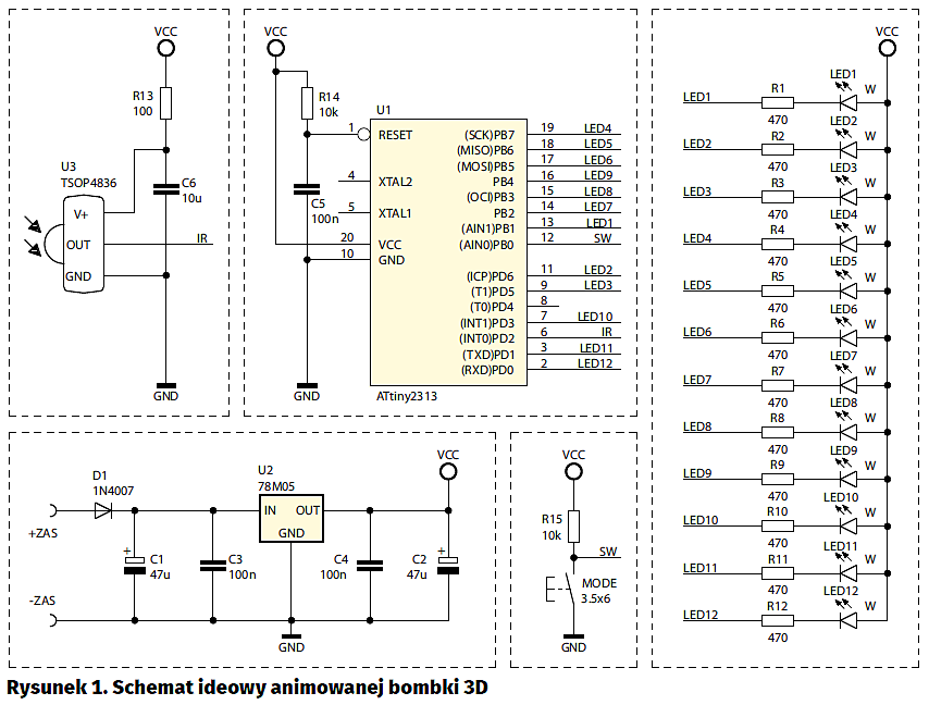 Schemat Bombki LED 3D pokazano na rysunku 1. Wykonano ją w oparciu o mikrokontroler ATtiny2313 (U1) taktowany za pomocą wewnętrznego generatora RC. Dioda D1 zabezpiecza bombkę przed odwrotną polaryzacją napięcia zasilającego doprowadzonego do pól lutowniczych „+ZAS” i „–ZAS”. Kondensatory C1…C4 oraz stabilizator U2 tworzą obwód zasilania mikrokontrolera, odbiornika podczerwieni oraz LED. Rezystor R14 i kondensator C5 zapewniają zerowanie mikroprocesora przy włączeniu zasilania. Rezystory R1…R12 ograniczają prąd diod LED.