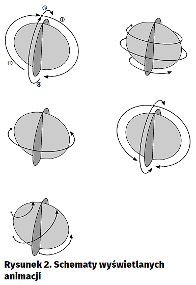 Bombka ma zapisane w pamięci 5 animacji – pokazano je na rysunku 2. Jedną z nich jest efekt obracającego się „koguta” ostrzegawczego. Każda z animacji kończy się po 20 cyklach wyświetlania, po czym jest wyświetlana kolejna. Gdyby czas oczekiwania na następną był zbyt długi, to za pomocą krótkiego naciśnięcia przycisku MODE można uruchomić wyświetlanie kolejnej. Jeśli MODE zostanie przytrzymany dłużej, to bombka przejdzie w stan uśpienia. Uruchomić ją można krótkim naciśnięciem przycisku MODE.