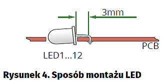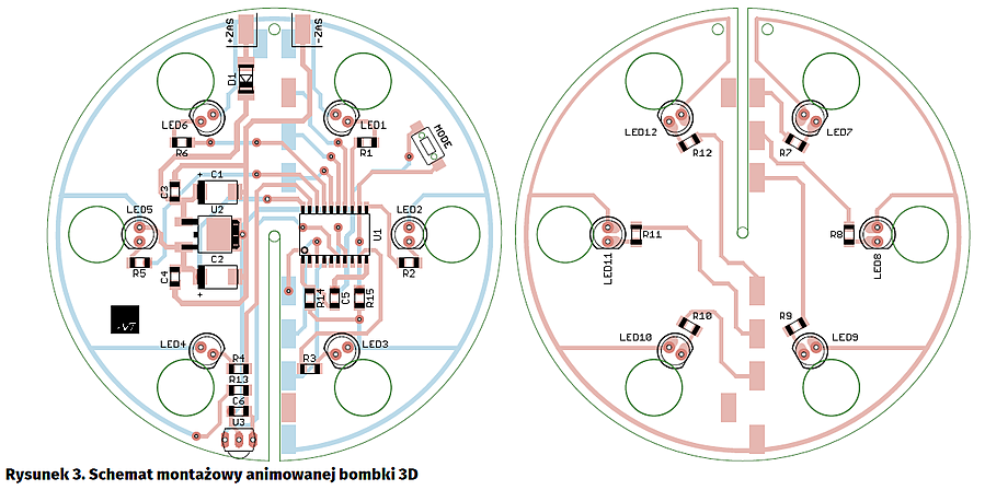 Schemat montażowy pokazano na rysunku 3. Całość zmontować należy na dwóch płytkach drukowanych o średnicy 81,5 mm każda. Większość elementów jest w obudowach do montażu powierzchniowego. Montaż rozpoczynamy od wlutowania rezystorów R1…R15 oraz kondensatorów C3…C5. W kolejnym etapie montujemy półprzewodniki, kondensatory C1 i C2 oraz przycisk typu mikroswitch. Na koniec należy wlutować diody LED profilując ich wyprowadzenia zgodnie z rysunkiem 4.