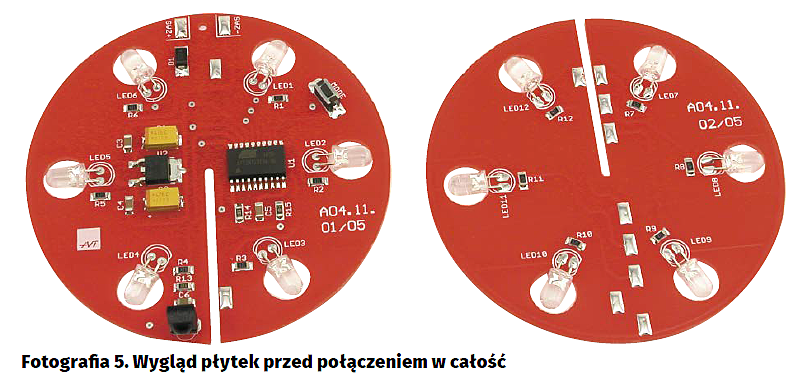 Wygląd zmontowanych, lecz niepołączonych w całość płytek znajduje się na fotografii 5. Po zmontowaniu obwodów drukowanych trzeba bardzo starannie skontrolować, czy elementy nie zostały wlutowane w niewłaściwym kierunku lub w niewłaściwe miejsca, a przede wszystkim czy podczas lutowania nie powstały zwarcia punktów lutowniczych. Mając pewność poprawnie zmontowanych płytek możemy teraz połączyć je razem wsuwając jedną w drugą. Sąsiednie pola lutownicze u styku obu płytek należy połączyć znaczną ilością cyny.