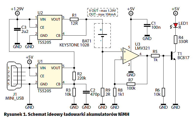 Ogniwa, które chciałem ładować to akumulatorki o pojemności około 2500 mAh, napięciu znamionowym 1,2 V, i rozmiarze AA. Są to akumulatorki typu NiMH. Schemat ideowy ładowarki pokazano na rysunku 1. Maksymalne napięcie na wyjściu ładowarki to 1,29 V, a maksymalny prąd wyjściowy to około 104 mA. Zasilanie jest dostarczane przez złącze mini USB na wejście stabilizatora U1. Na jego wyjściu występuje napięcie 1,29 V ustalane przez rezystory R2 i R3. Wzór na napięcie wyjściowe to Vout=1,24×(1+R3/R2). Stabilizator U2 pracuje w układzie ogranicznika prądowego. Rezystor R1 ustala prąd ogranicznika na około 104 mA. Jego wartość wyznacza się z prawa Ohma – Iout=1,24 V/R1.