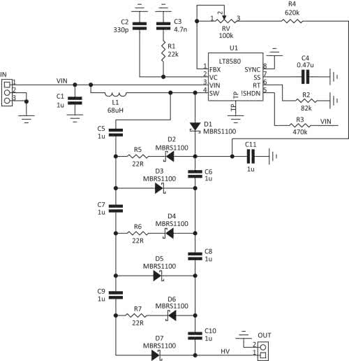 Potencjometr RV umożliwia dokładne ustawienie napięcia wyjściowego. Rezystor R2 określa częstotliwość kluczowania na ok. 1 MHz. Kondensator C4 jest elementem układu łagodnego startu przetwornicy. Kondensatory C2 i C3 oraz rezystor R1 zapewniają stabilność układu regulacji. Pojemności C1 i C11 filtrują napięcia zasilania i wyjściowe. W aplikacji przetwornica pracuje z napięciem wyjściowym około 65 V. Aby uzyskać napięcie 250 V, zastosowano powielacz napięcia złożony z diod D1…D7 i kondensatorów C6…C10. Napięcie wyjściowe powielacza jest wyprowadzone na złącze OUT.