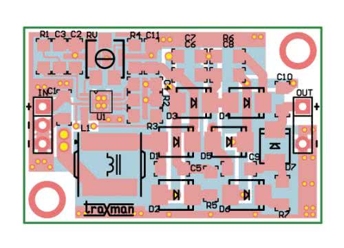 Układ zmontowano na niewielkiej jednostronnej płytce drukowanej. Rozmieszczenie elementów pokazano na rysunku 2. Montaż przetwornicy nie wymaga opisywania. Uruchomienie modułu sprowadza się do regulacji napięcia wyjściowego. W tym celu do wyjścia należy dołączyć rezystor 20 kΩ/5 W, do wejścia zasilanie 9…16 V i potencjometrem RV ustawić napięcie wyjściowe na 250 V DC.