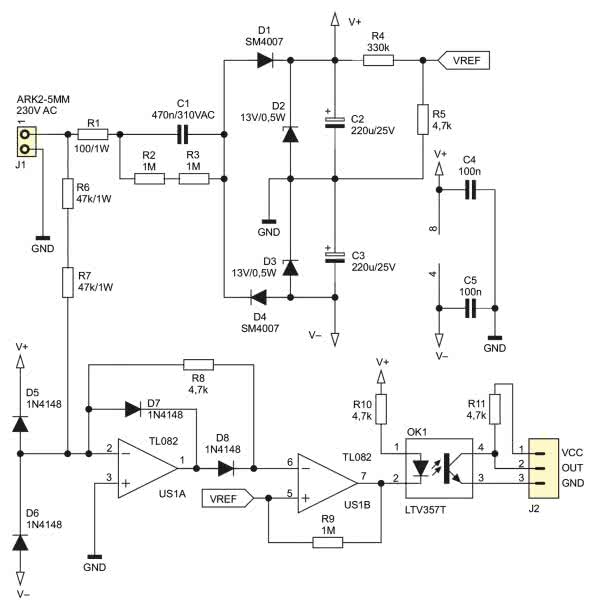 Wyjście wzmacniacza US1B daje gotową informację o momentach przejścia przez zero, ale sygnał wyjściowy powinien być odseparowany galwanicznie. Ponieważ przenoszona informacja jest wyłącznie zero-jedynkowa, zastosowano do tego transoptor. W układzie znalazło się miejsce na rezystor kolektorowy R11, dzięki czemu do zacisków złącza J2 wystarczy podłączyć napięcie o wartości ok. 5 V, a na środkowym wyprowadzeniu pojawią się impulsy prostokątne. Zwiększenie wartości R11 umożliwia pracę przy wyższym napięciu, lecz wpłynie to niekorzystnie na parametry układu.