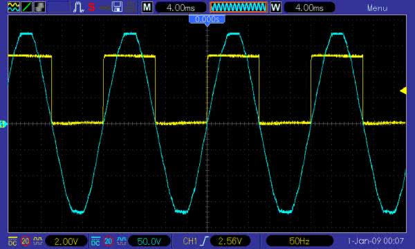 Przebieg napięcia wyjściowego (żółty) na tle napięcia sieciowego (niebieski) pokazuje rysunek 4. Widać na nim, że przejściu przez zero z dodatnią pochodną odpowiada zbocze narastające sygnału prostokątnego, a z ujemną – opadające.