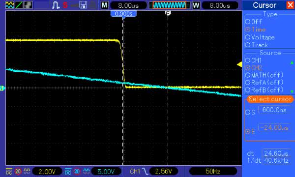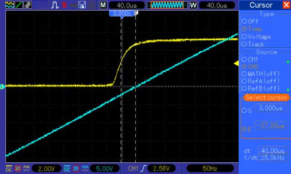 Momenty przejścia przez zero dokładnie pokazują rysunki 5 i 6. Za pomocą kursorów oscyloskopu zmierzono odstęp czasowy pomiędzy zadziałaniem detektora a faktycznym momentem przejścia przez zero. W przypadku zbocza narastającego różnica ta wyniosła ok. 40 μs, a dla opadającego ok. 25 μs.