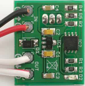 Montaż układu należy rozpocząć od elementów najmniejszych, jako ostatni należy zamontować tranzystor T1. Zmontowana płytka pokazana jest na fotografiach 4 i 5, układ jest od razu gotowy do pracy.