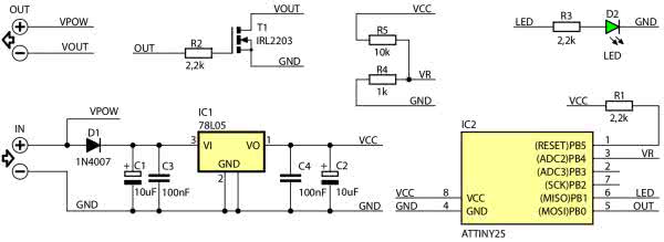 Układ włączany jest między źródło zasilania a odbiornik. Dioda D1 zabezpiecza układ przed dołączeniem go do napięcia o niewłaściwej polaryzacji. Napięcie wejściowe jest podawane na stabilizator IC1 typu 78L05, natomiast kondensatory C1...C4 zapewniają odpowiednią filtrację tego napięcia. Pracą układu steruje mikrokontroler IC2 ATTINY25, a jego praca rozpoczyna się natychmiast po dołączeniu napięcia zasilania.
