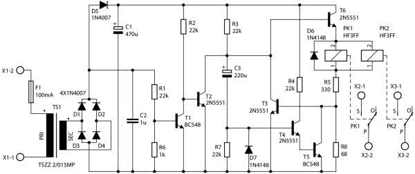Po włączeniu napięcia sieci szybko ładują się kondensatory C1 i C2. Tranzystor T1 zostaje otwarty i zwiera do masy bazę tranzystora T2. Umożliwia to ładowanie kondensatora C3. C3 jest ładowany przez R3. Rezystancja R7 nie ma wpływu na ładowanie, ponieważ dołączone równolegle dwa złącza baza-emiter T4 i T5 utrzymują na R7 podczas ładowania napięcie około 1,2 V. Tranzystory T4 i T5 podczas ładowania C3 są otwarte. Otwarty tranzystor T5 zwiera do masy bazę T3. Napięcie na kolektorze T5 jest praktycznie równe potencjałowi masy. Rosnące napięcie na kondensatorze C3 i bazie T6 powoduje też wzrost napięcia na emiterze T6, a napięcie występujące na emiterze T6 dzieli się: większa część występuje na cewkach przekaźników, mniejsza na rezystorze R5. Po kilku sekundach od włączenia zasilania napięcie na przekaźnikach wzrośnie na tyle, że zewrą one swoje styki i dołączą głośniki do wyjścia wzmacniacza. Napięcie na C3 rośnie nadal, a co ważne, w miarę ładowania maleje prąd płynący przez R3. Maleje też prąd płynący w obwodzie bazy T4 i T5. Gdy kondensator C3 jest już prawie całkowicie naładowany, prąd ładowania jest tak mały, że prąd bazy T4 maleje do zera, co powoduje zatkanie T4 i T5. Wcześniej tranzystor T5 zwierał do masy bazę T3, a przez cewki przekaźników płynął prąd o wartości zbliżonej do jego prądu nominalnego. Po zatkaniu T5 uaktywnia się obwód oszczędzania prądu. Wykorzystuje się tu fakt, że w przekaźniku prąd podtrzymywania jest kilka razy mniejszy od prądu nominalnego. Dlatego po zadziałaniu przekaźników można śmiało obniżyć prąd i napięcie na przekaźnikach. Realizuje to T3 i R8, które wraz z T6 tworzą typowy układ źródła prądowego. Spadek napięcia na R8 powoduje częściowe otwarcie T3, a tym samym takie obniżenie napięcia na C3 i na przekaźnikach, żeby utrzymać na R8 napięcie około 0,7 V.