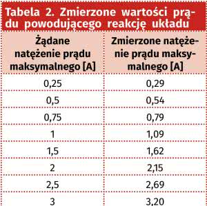 Tolerancja użytych elementów, rozrzuty pozostałych parametrów oraz histereza komparatora powodują powstanie pewnej odchyłki między wartością prądu podaną na płytce a tą, przy której układ faktycznie zareaguje. W tabeli 2 zebrano wyniki tych pomiarów. Spadek napięcia na zaciskach złącza J1 uzależniony jest od natężenia płynącego przez nie prądu. Jego wartość maksymalna wynosi ok. 0,35 V (dla prądu 3 A).