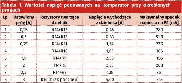 Napięcie referencyjne, którym sterowany jest komparator, dostarcza stabilizator typu 78L05. Dokładność nie jest wprawdzie wysoka, ale wystarczająca na potrzeby tak prostego układu. Zaletą jego zastosowania jest niska cena oraz wysoka wydajność prądowa. Powstałe w ten sposób napięcie o wartości 5 V jest dzielone z użyciem dzielnika napięcia, który tworzy rezystor R14 i jeden z rezystorów R7…R13. Tabela 1 zawiera zestawienie uzyskiwanych w ten sposób napięć, podawanych na wejście nieodwracające oraz odpowiadających im wartości prądów wyzwalających. Na wejście odwracające wchodzi sygnał ze wzmacniacza, co oznacza, że przekroczenie dopuszczalnej wartości prądu spowoduje szybkie nasycenie jego tranzystora wyjściowego, czyli spadek potencjału wyjścia. Aby zminimalizować ryzyko powstawiania oscylacji na progu przełączenia, wprowadzono niewielką histerezę, którą realizuje rezystor R17.