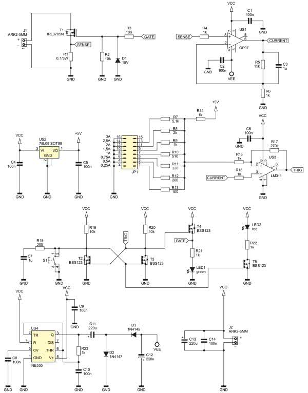 Przedstawiony układ działa jak wyłącznik nadmiarowoprądowy – po przekroczeniu zadanej wartości pobieranego prądu odcina dopływ zasilania i sygnalizuje to przełączeniem diod LED. Przywrócenie zasilania jest bardzo proste, wystarczy pstryknąć przyciskiem. Układ doskonale nadaje się do monitorowania stanu pracy układów, które łatwo mogą zostać przeciążone, np. zawierających silniki prądu stałego lub do uchronienia testowanych prototypów przed bezpowrotnym zniszczeniem w razie awarii.