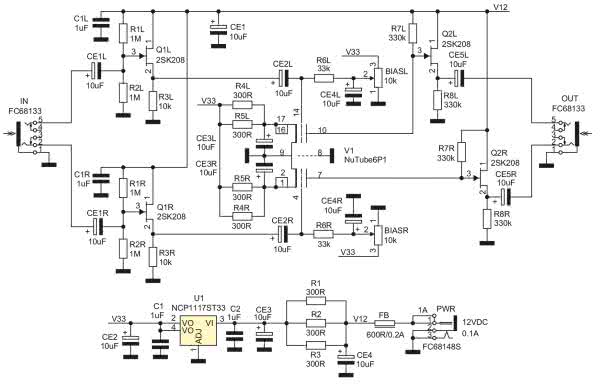 Prezentowany wzmacniacz linowy jest hybrydą elementów dyskretnych i lampy 6P1 (fotografia 1). Jest prosty w montażu i uruchomieniu, omija problemy spotykane w klasycznych układach lampowych. Schemat wzmacniacza pokazuje rysunek 2. Układ oparty jest na fabrycznej aplikacji proponowanej przez producenta lampy, firmę Korg. Elementy kanału lewego oznaczone są zakończeniem L, prawego R, elementy wspólne nie mają dodatkowych oznaczeń.