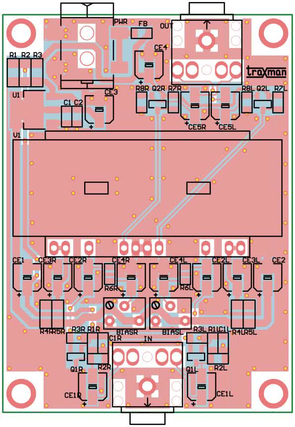 Wszystkie elementy przedwzmacniacza umieszczone są na dwustronnej płytce drukowanej. Schemat płytki, wraz z rozmieszczeniem elementów pokazuje rysunek 3. Montaż płytki jest typowy i nie wymaga opisu. Podczas lutowania lampy należy zachować ostrożność, ponieważ łatwo uszkodzić kruche wyprowadzenia tego nietypowego elementu. Przed montażem warto podkleić lampę taśmą dwustronną do powierzchni płytki. Zmontowany układ widoczny jest na fotografii tytułowej.