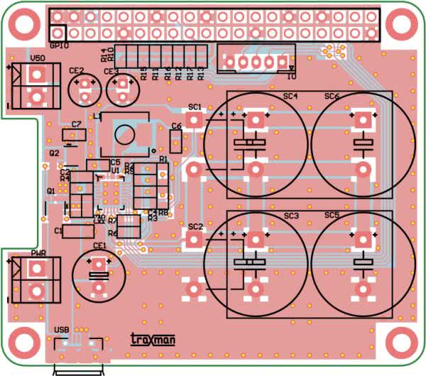 Układ zmontowany jest na dwustronnej płytce drukowanej zgodnej z HAT (bez EEPROM-u konfiguracji) rozmieszczenie elementów pokazano na rysunku 3. Montaż układu nie wymaga szczegółowego opisu, należy tylko zadbać o poprawne przylutowanie padów termicznych i o umycie płytki po lutowaniu. Prawidłowo zmontowany moduł pokazano na fotografii tytułowej. Płytka umożliwia zastosowanie dwóch kondensatorów wlutowanych w pozycji leżącej SC1, SC2 dla zmniejszenia wysokości lub do dwóch par SC3, SC4 i SC5, SC6 wlutowanych na stojąco, gdy zależy nam na największej pojemności.