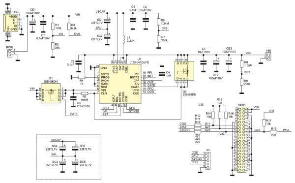 Zasilacz buforowy jest typową aplikacją specjalizowanego układu LTC4041 (Analog Devices), której schemat pokazano na rysunku 1. Strukturę wewnętrzną układu LTC4041 pokazano na rysunku 2. W wersji rev.0 noty niestety błędnie opisane są niektóre wyprowadzenia, poprawne oznaczenia i numeracja zamieszczone są na schemacie i rysunku obudowy LTC4041 w karcie katalogowej. Dzięki zastosowaniu specjalizowanego układu, aplikacja zawiera niewiele elementów zewnętrznych ograniczających się do dzielników rezystorowych układów monitorowania napięć oraz kluczy wykonawczych przetwornicy DC/DC. Układ LTC4041 posiada wszystkie niezbędne zabezpieczenia wymagane dla bezpiecznej eksploatacji superkondensatorów, łącznie z komparatorami i balanserem.