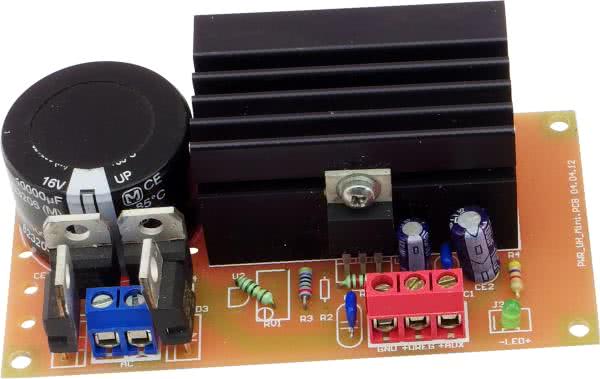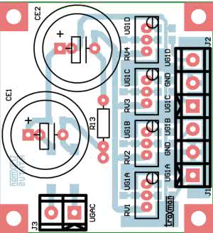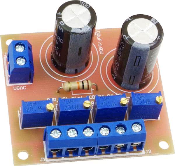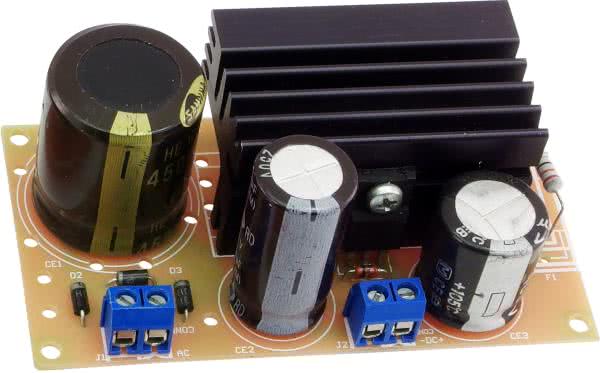 Napięcie po filtracji dostępne jest na złączu J2-1 i może służyć do zasilania układów sterujących (np. zdalne sterowanie wzmacniacza), dioda LED podłączona do złącza J3 sygnalizuje obecność zasilania. Odfiltrowane napięcie doprowadzone jest do stabilizatora regulowanego U1 LT1085, dzielnik R1,2 ustala wartość napięcia wyjściowego. Kondensatory CE2 i CE3 odsprzęgają zasilanie. Ze względu na uniwersalność układu, która nie ogranicza jego zastosowania tylko do zasilania urządzeń lampowych, na płytce znajduje się miejsce na dodatkowe elementy R3, RV1 oraz na napięcie odniesienia U2, zastępujące rezystor R2, umożliwiające budowę zasilacza precyzyjnego.